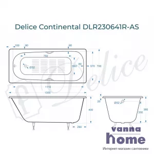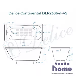 Ванна чугунная Delice Continental 130x70 с антискользящим покрытием