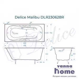 Ванна чугунная Delice Malibu 140x75 с отверстиями для ручек