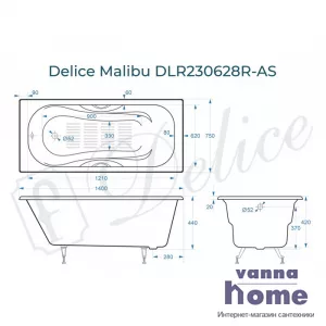 Ванна чугунная Delice Malibu 140x75 с антискользящим покрытием