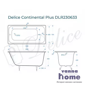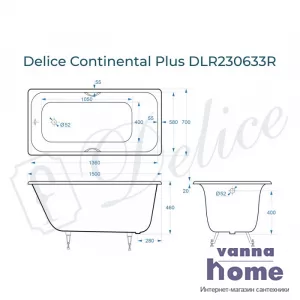 Ванна чугунная Delice Continental Plus 150x70 с отверстиями для ручек