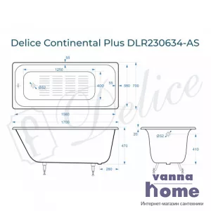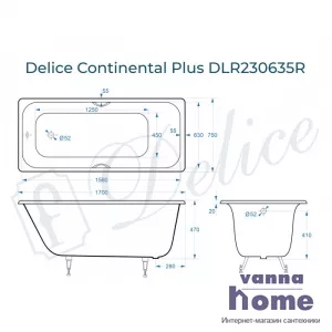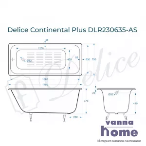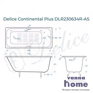 Ванна чугунная Delice Continental Plus 170x70 с антискользящим покрытием