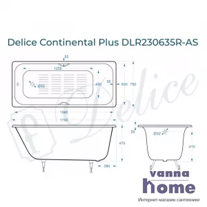 Ванна чугунная Delice Continental Plus 170x75 с антискользящим покрытием