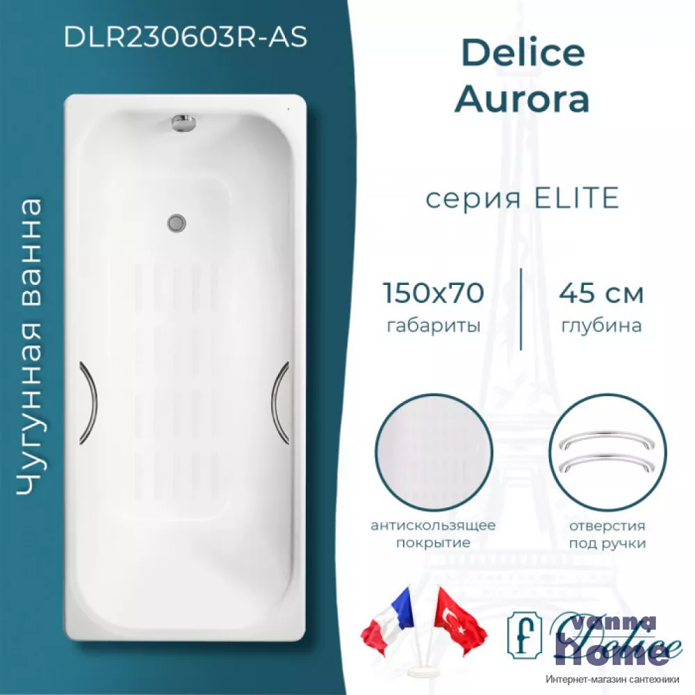 Ванна чугунная Delice Aurora 150x70 с отверстиями для ручек и антискользящим покрытием