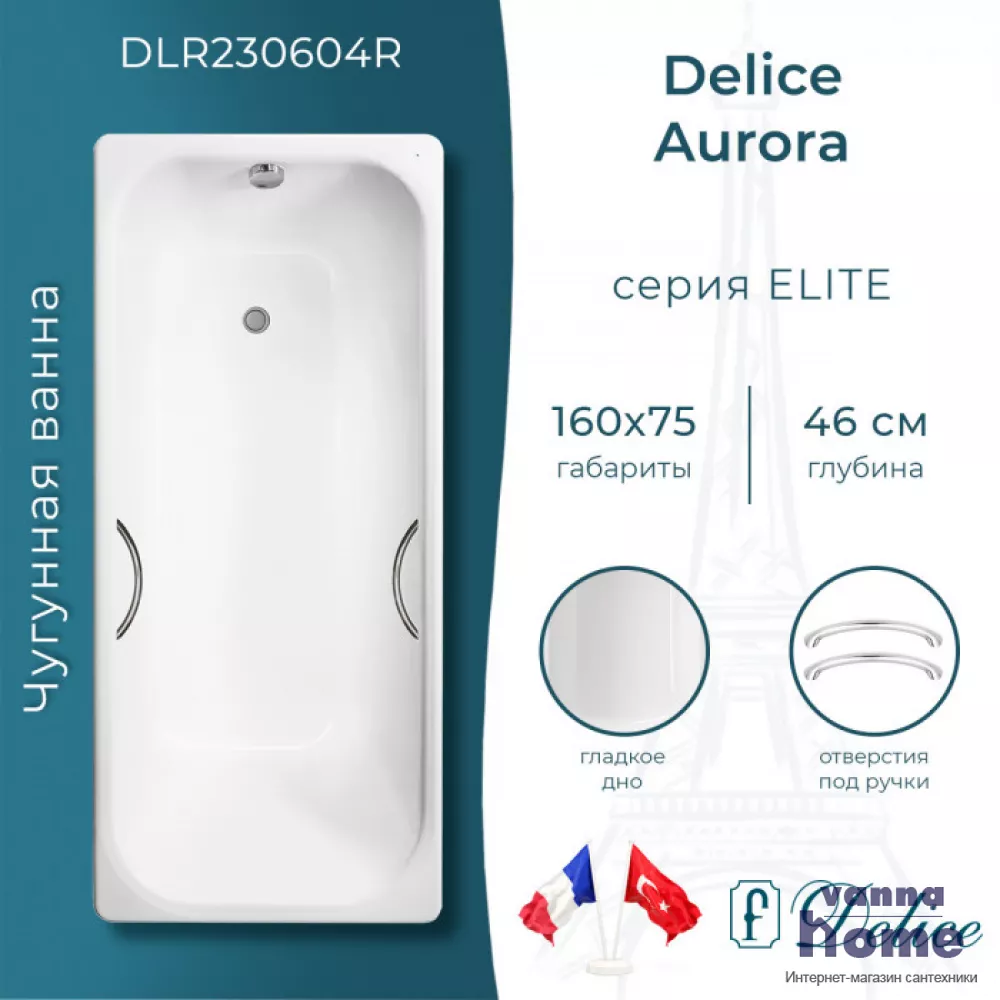 Чугунная ванна Delice Aurora 160x75 с заводскими отверстиями под ручки — это высокотехнологичное изделие от бренда Delice (страна бренда — Франция). Модель разработана для просторных помещений, где требуется сочетание изысканной эстетики, легендарной прочности чугунного литья и максимальной безопасности.