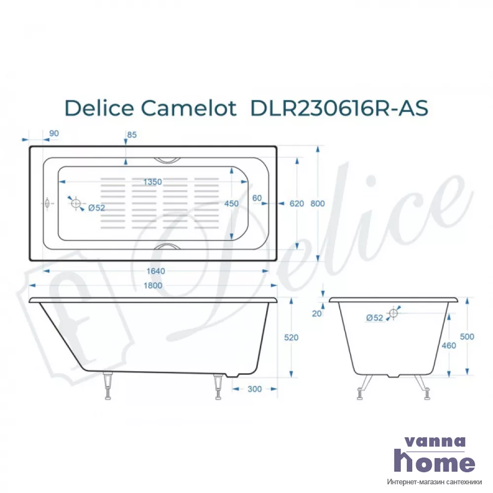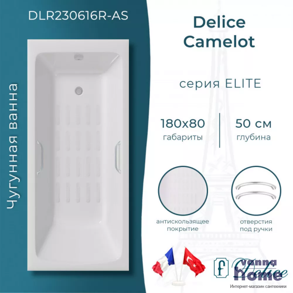 Ванна чугунная Delice Camelot 180x80 с отверстиями для ручек и антискользящим покрытием