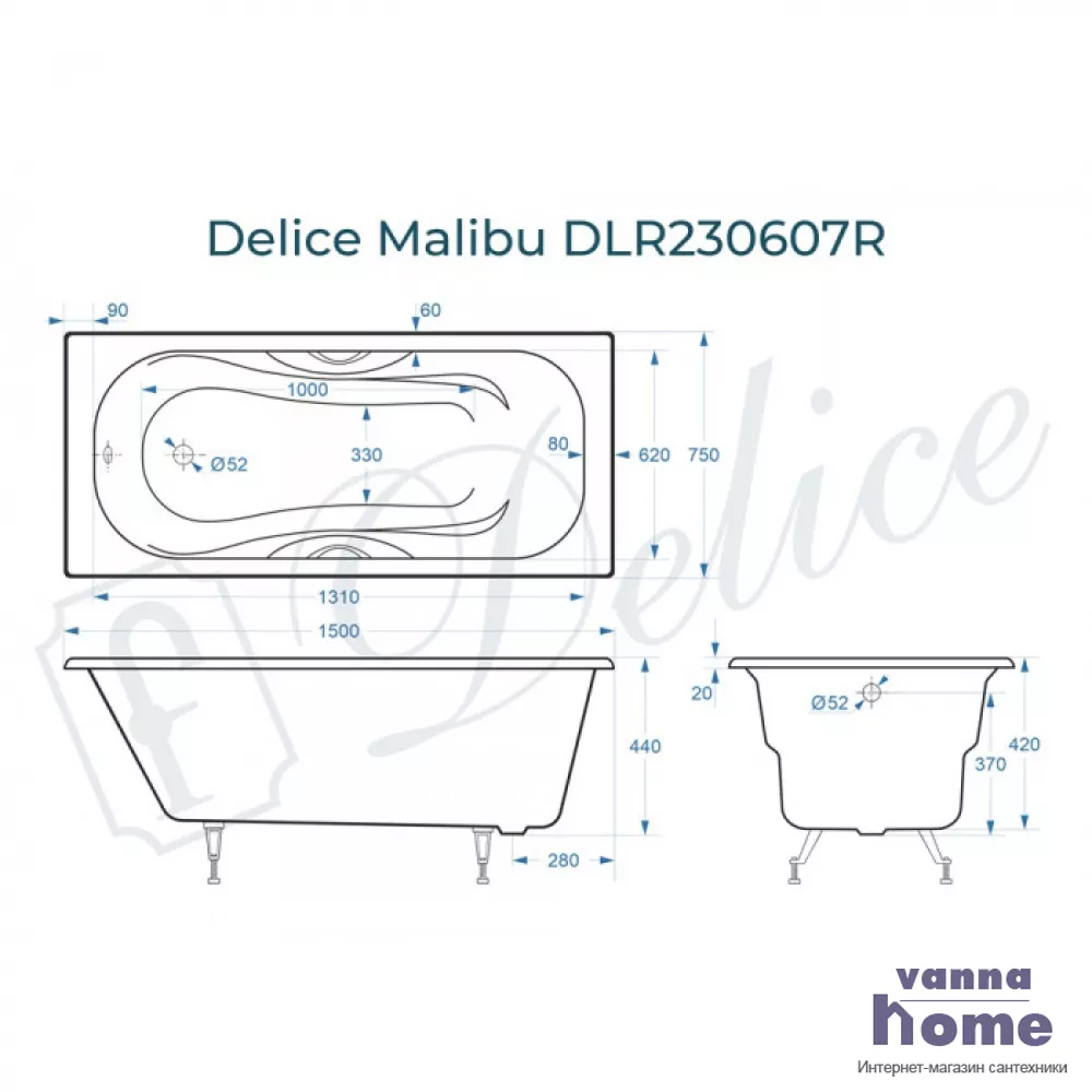 Ванна чугунная Delice Malibu 150x75 с отверстиями для ручек