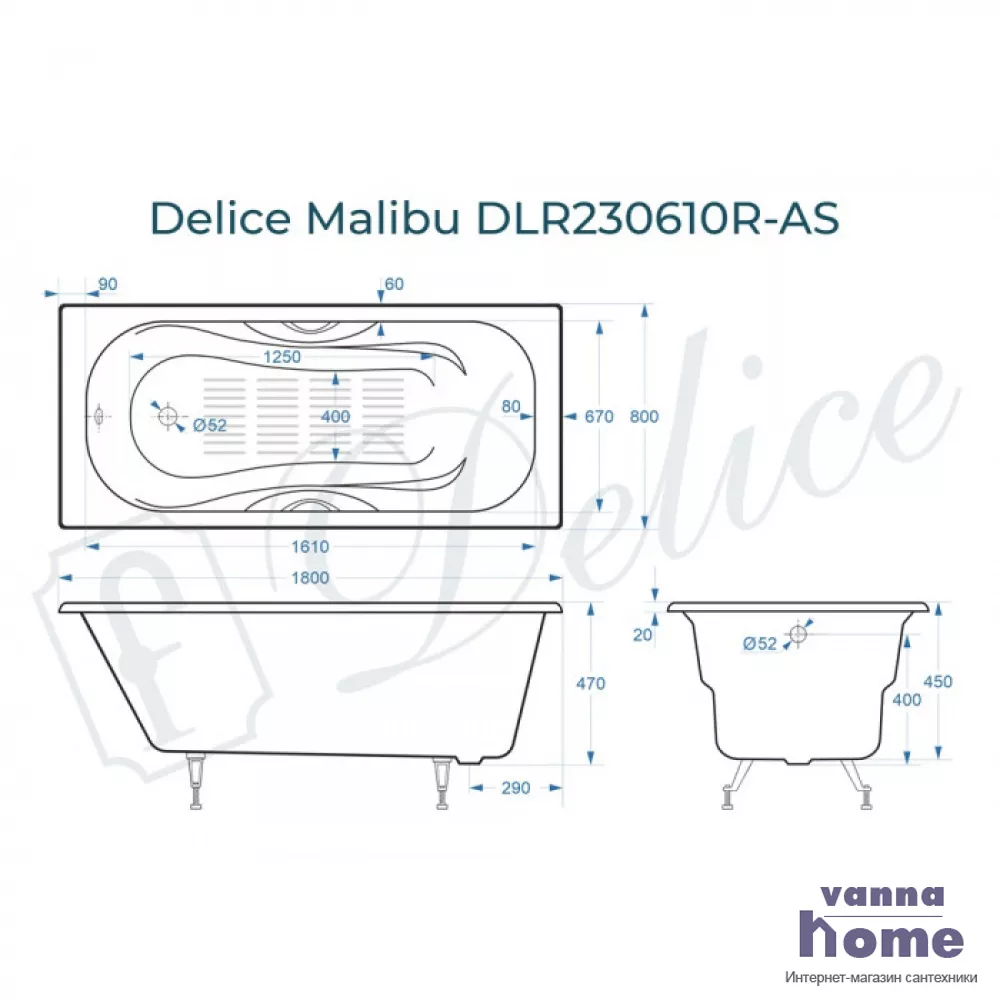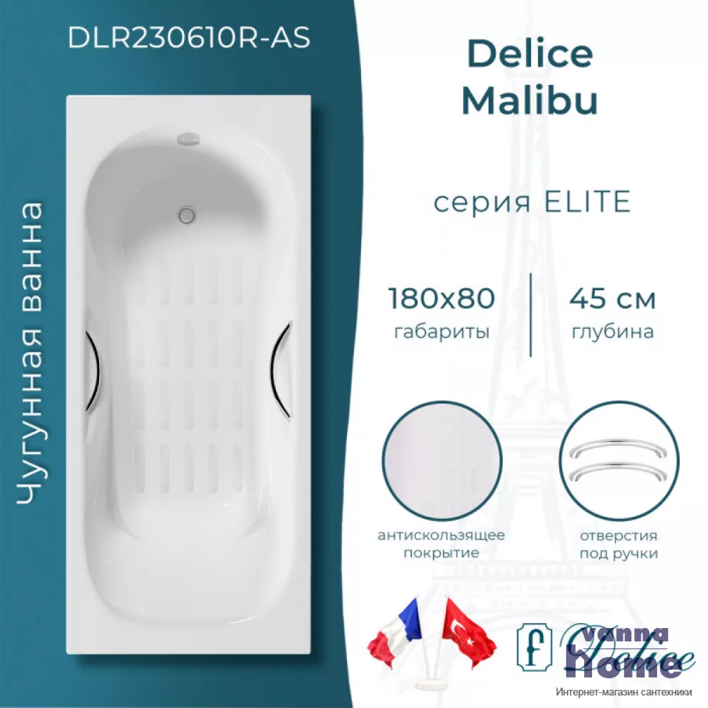 Ванна чугунная Delice Malibu 180x80 с отверстиями для ручек и антискользящим покрытием