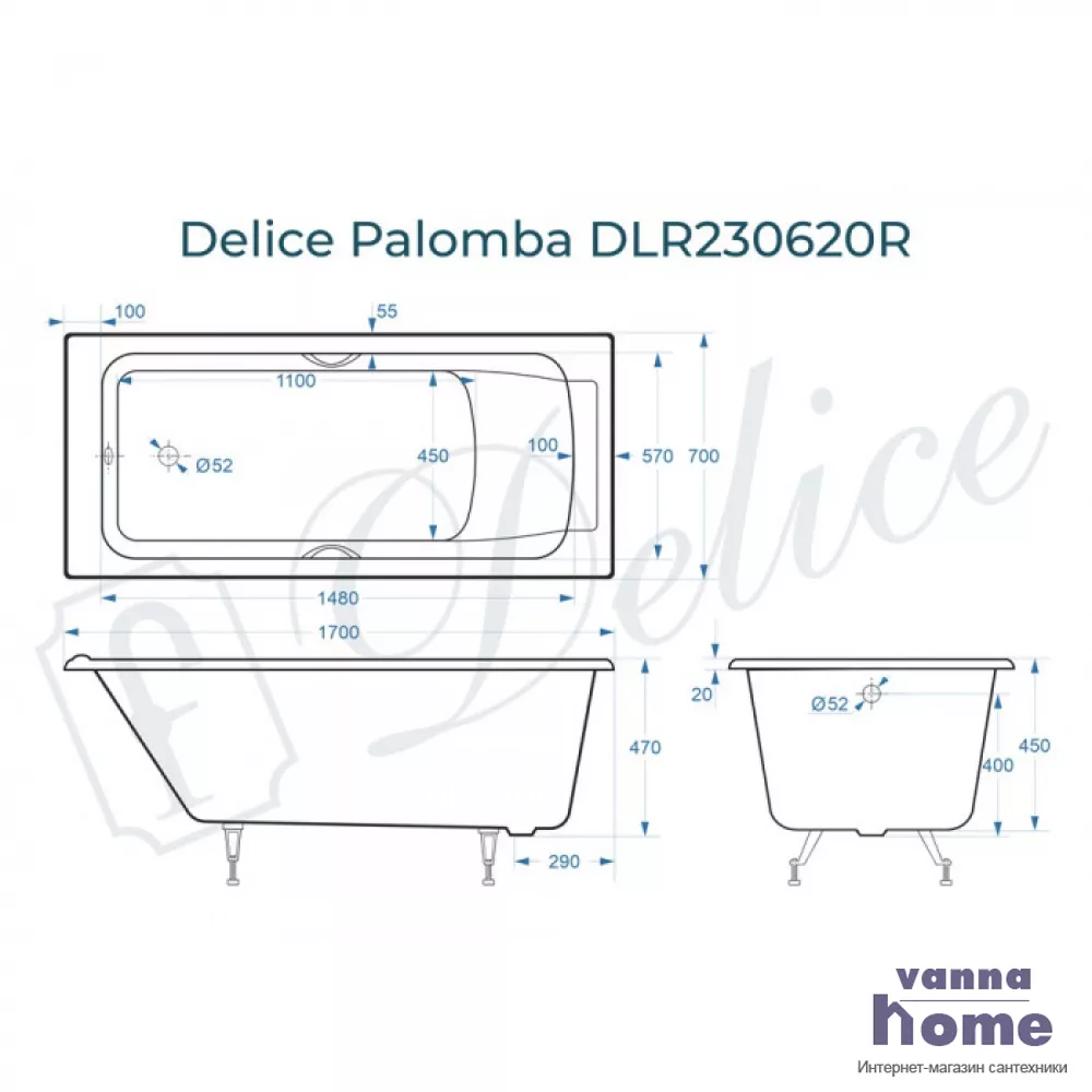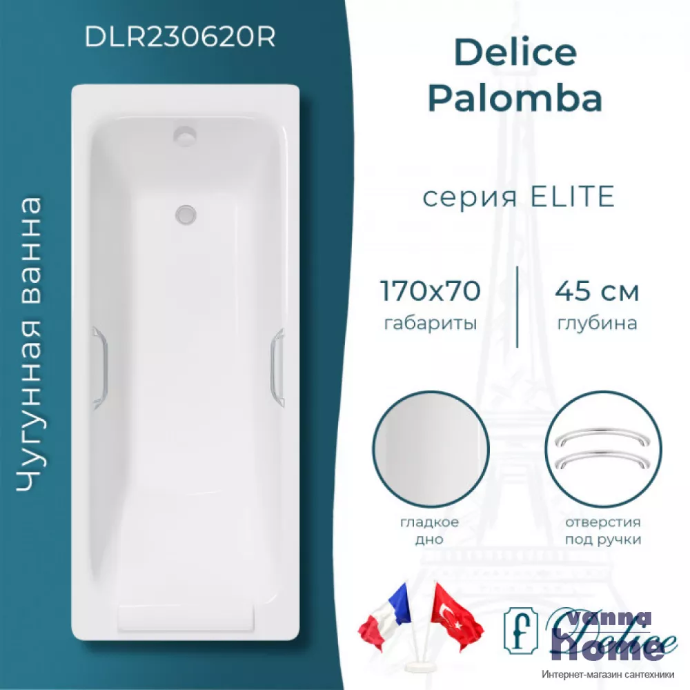 Ванна чугунная Delice Palomba 170x70 с отверстиями для ручек