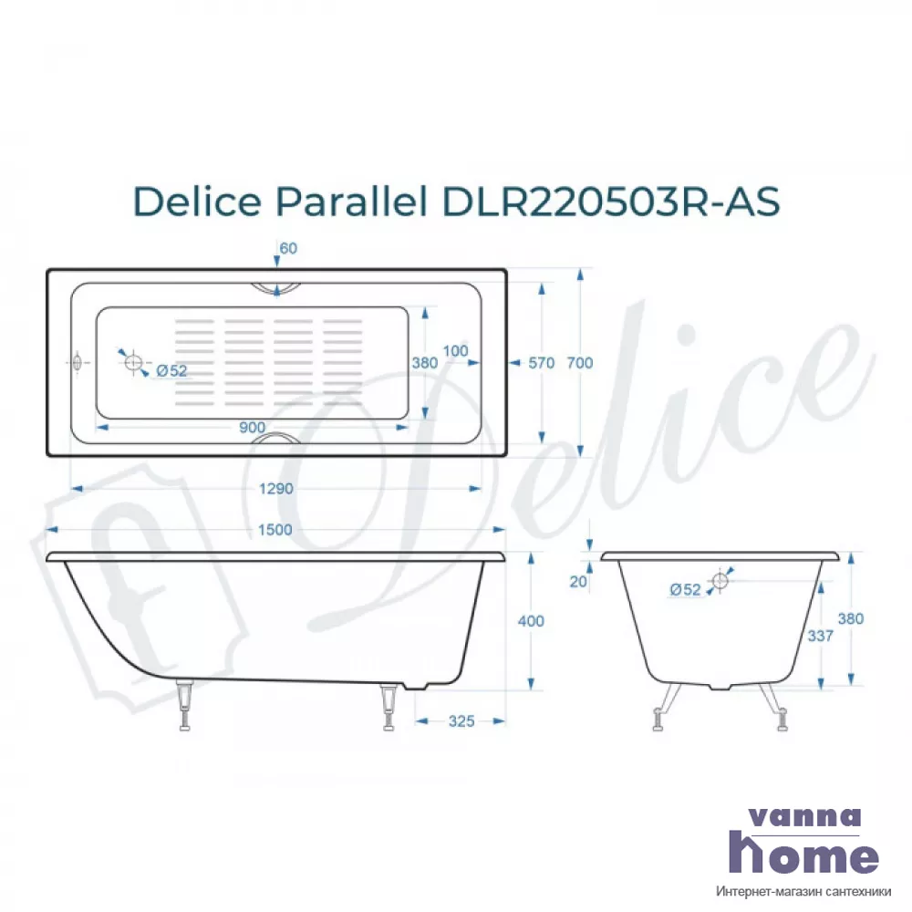 Ванна чугунная Delice Parallel 150x70 с ручками и антискользящим покрытием
