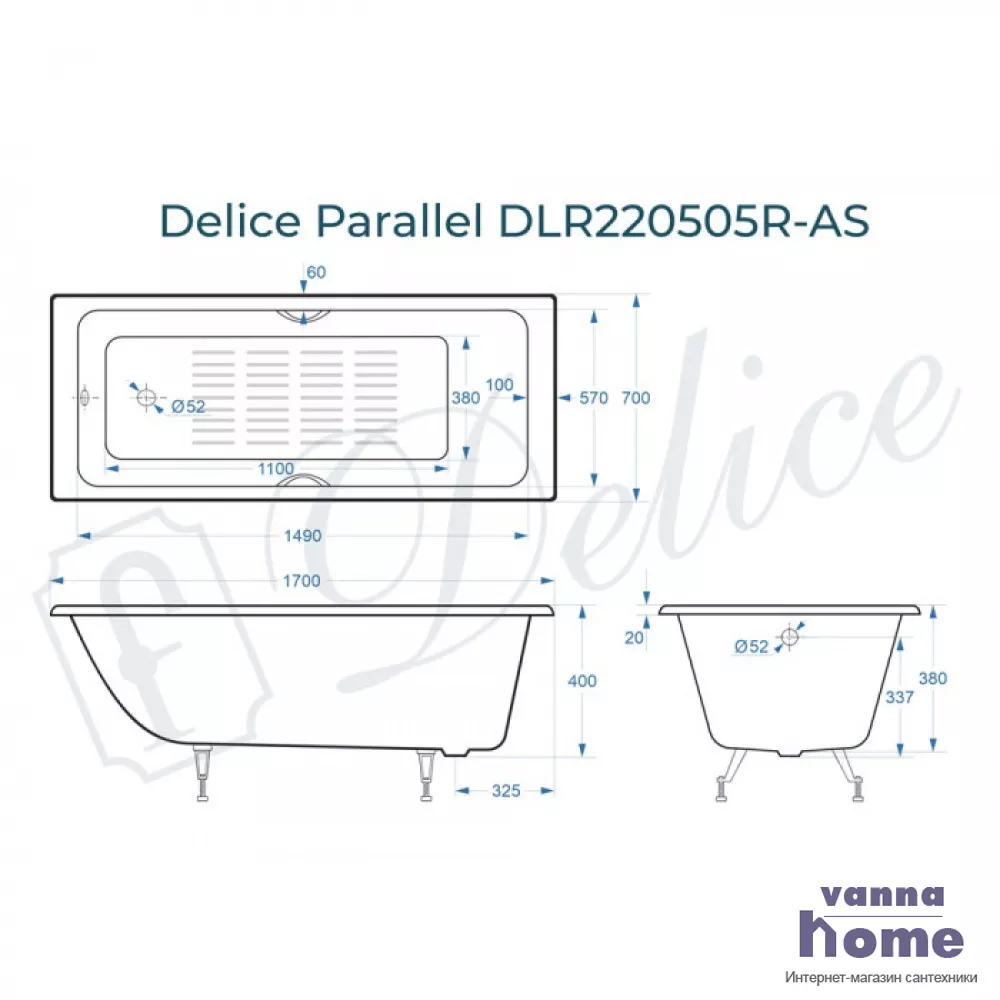 Ванна чугунная Delice Parallel 170x70 с ручками и антискользящим покрытием