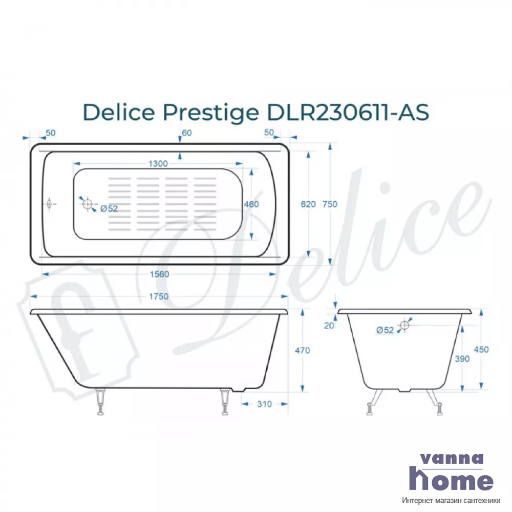 Ванна чугунная Delice Prestige 175x75 с антискользящим покрытием
